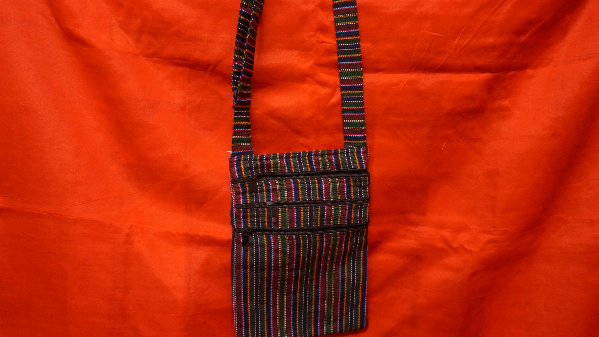 Small traditionally hand-maded Three Zip Multi-Stripe Tote from Nepal.